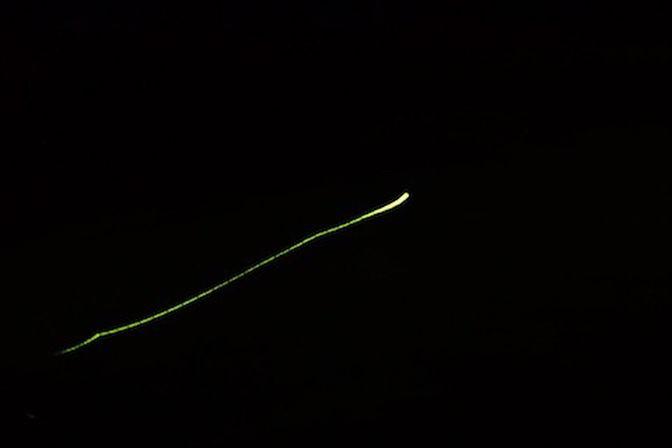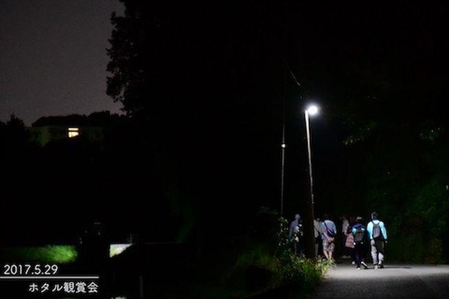 歩いていくと遠くの方にホタルたちの明りが見えています。