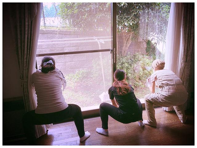 朝集合して、まずは助産師による赤ちゃんの心音チェックと妊婦さんの体調チェック。その後たっぷり2時間ひたすら股割りの姿勢での床拭きや草むしり、スクワットの姿勢で窓ふき。産むために必要な内またの筋肉を鍛え、赤ちゃんに骨盤のほうにおりてきてもらうための作業だそうです。けっこうハードですが上記の楽しみがあるから頑張れます!