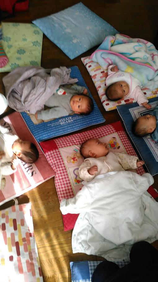 赤ちゃんの写真は6人全員集まる前でしたので5人ですが。約1名、カメラ目線?