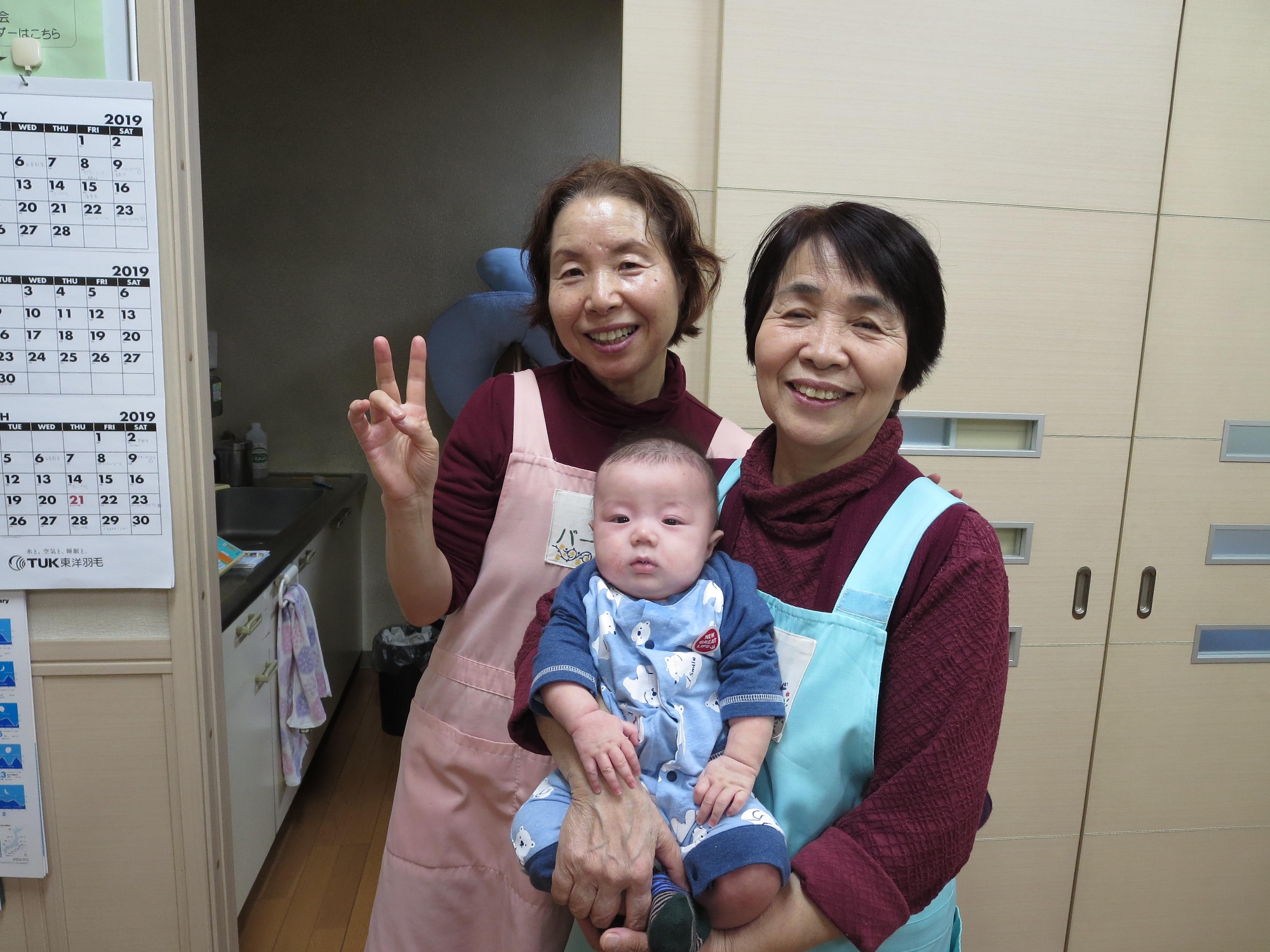 知らないところに産後のショートステイで入院するのは緊張だったとはおもいますが、バースあおばに身をまかせてもらい、なんとすぐにおっぱいは吸えるようになりました。それから生後3ヶ月まで、ショートステイとデイケアを利用し、すっかりTさんはバースあおばのママになっていましたね。赤ちゃんのKちゃんもだんだんと発達し、仲さんや柳澤さんの顔を見て喜ぶようになりました。Kちゃんは来所するたびに学生さんやスタッフに抱っこされて色々な刺激を受けて育ちました。まるでバースあおばで産まれたみたいです。