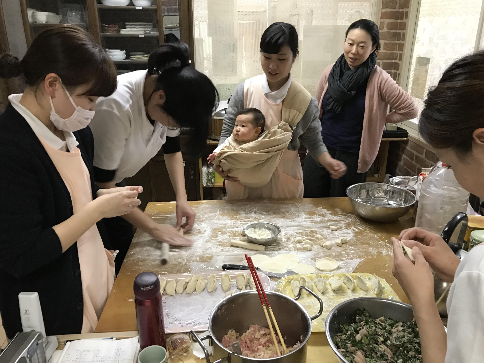 餃子を作りながら赤ちゃんを抱っこしている学生さん。その隣はそのママ(デイケア利用中。なぜか一緒に厨房に)