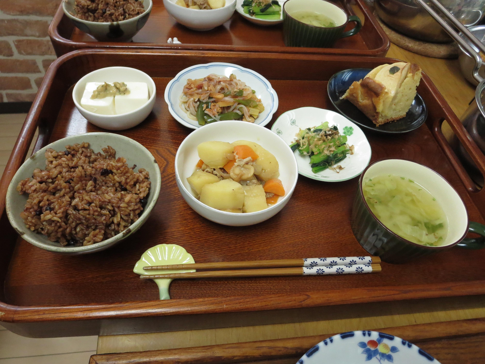肉じゃがの具を全部準備してもらい、ケーキはオーブンに入れる以外は全部作ってもらいました。丁寧に盛り付け、配膳もしてもらいました。