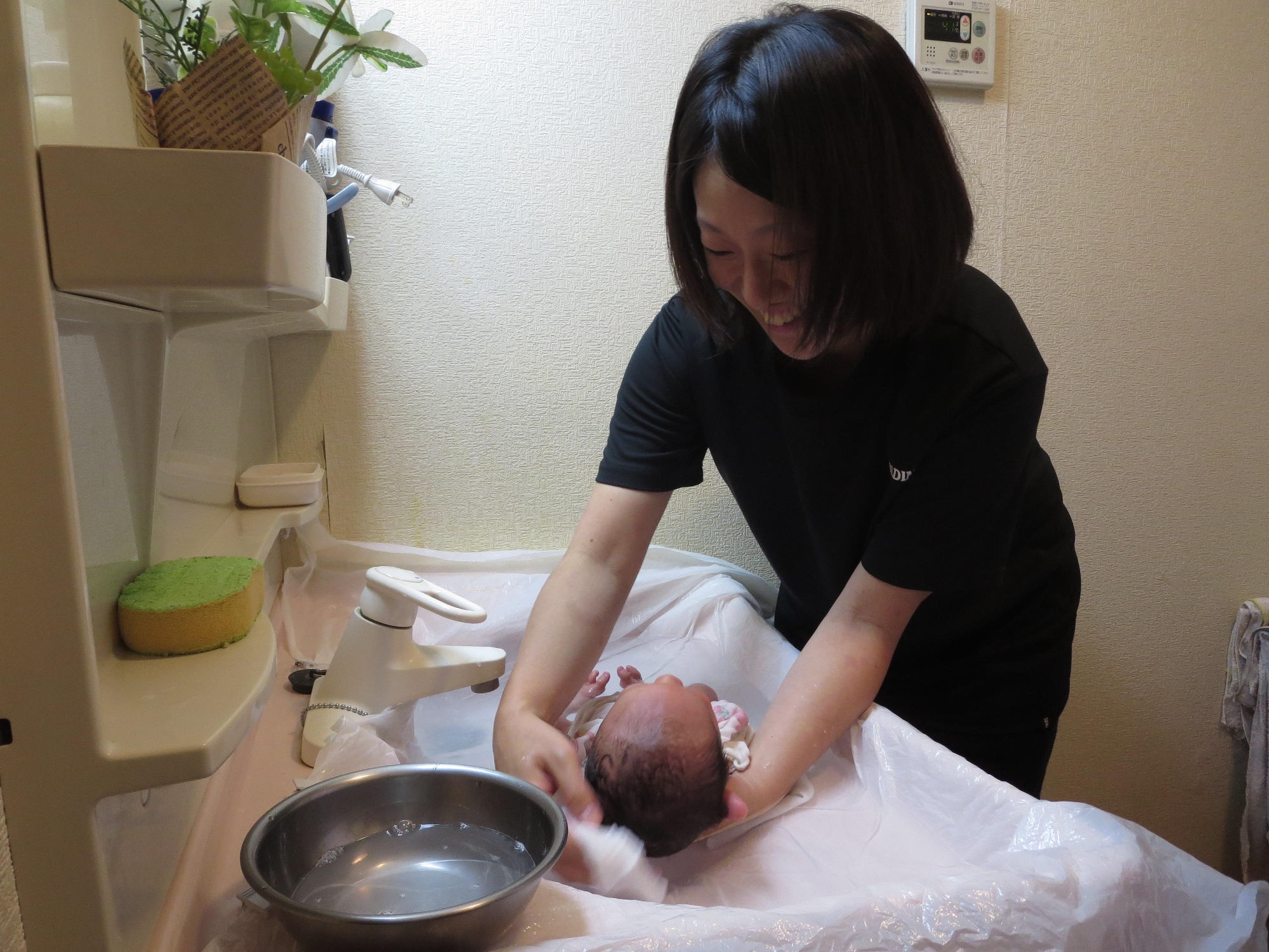まずは、スタッフが沐浴しているところを見学。次の日に実際にママ、もしくはパパがいれます。スタッフか学生さんが付き添います。