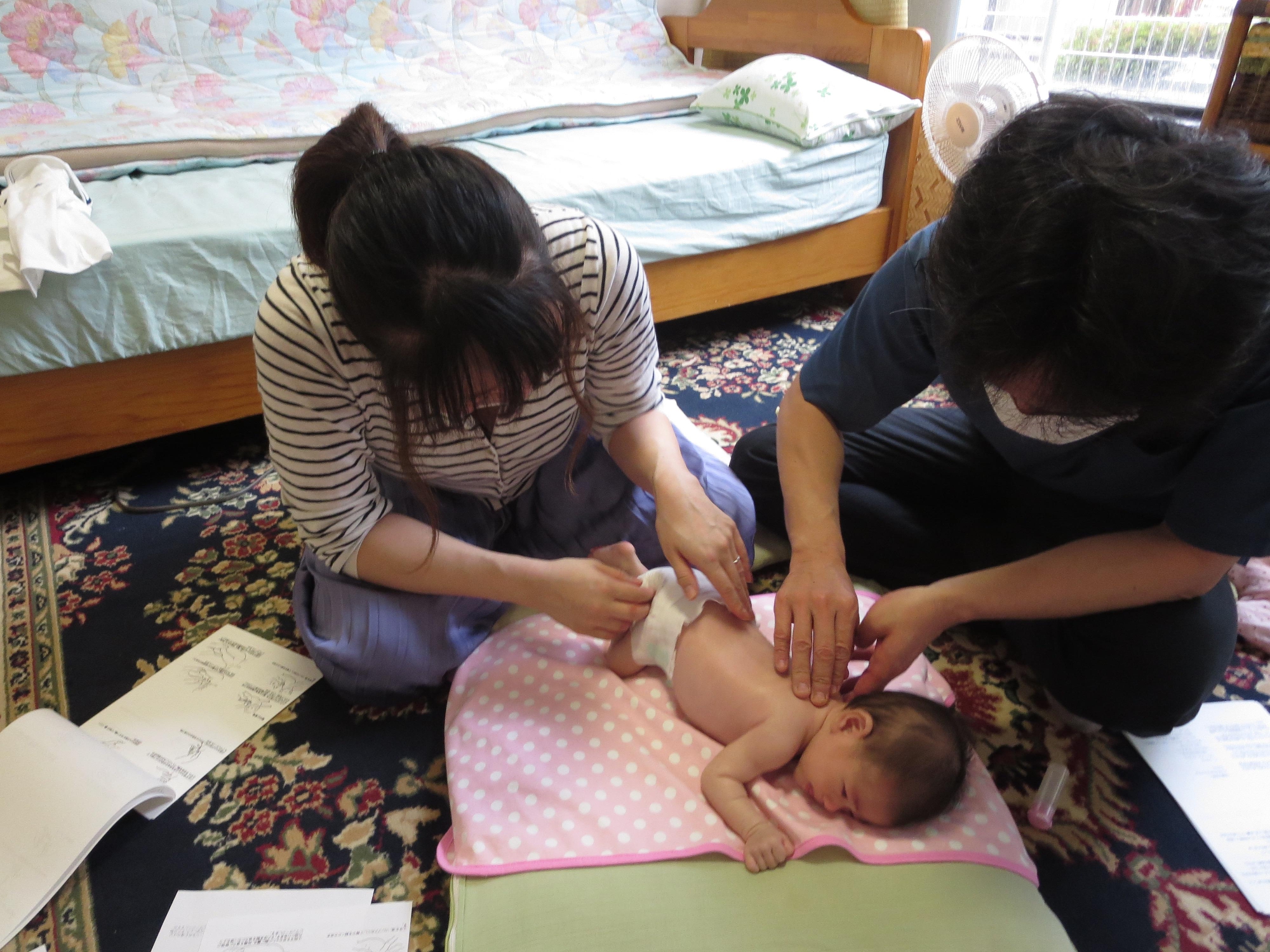 一組の親子が参加してくれました!童謡の音楽にあわせながら、気持ち良さそうに受けてくれました!しかし赤ちゃんの集中力はそんなに長くは続きません(^^)。