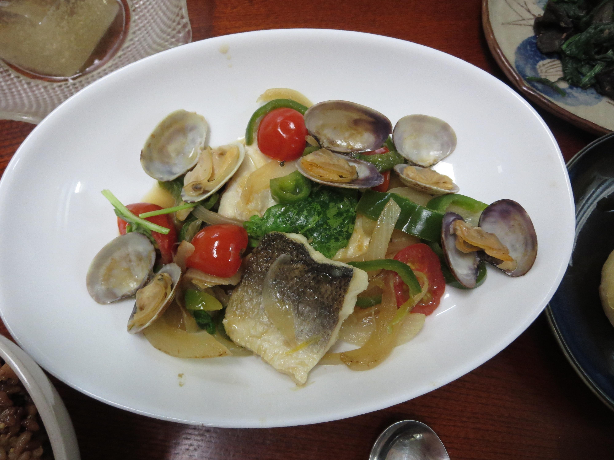今日のメインは魚介の酒蒸しです。かます(以前に入院していた方の面会時の差し入れで頂きました!)、あさりのダシが美味しい!
