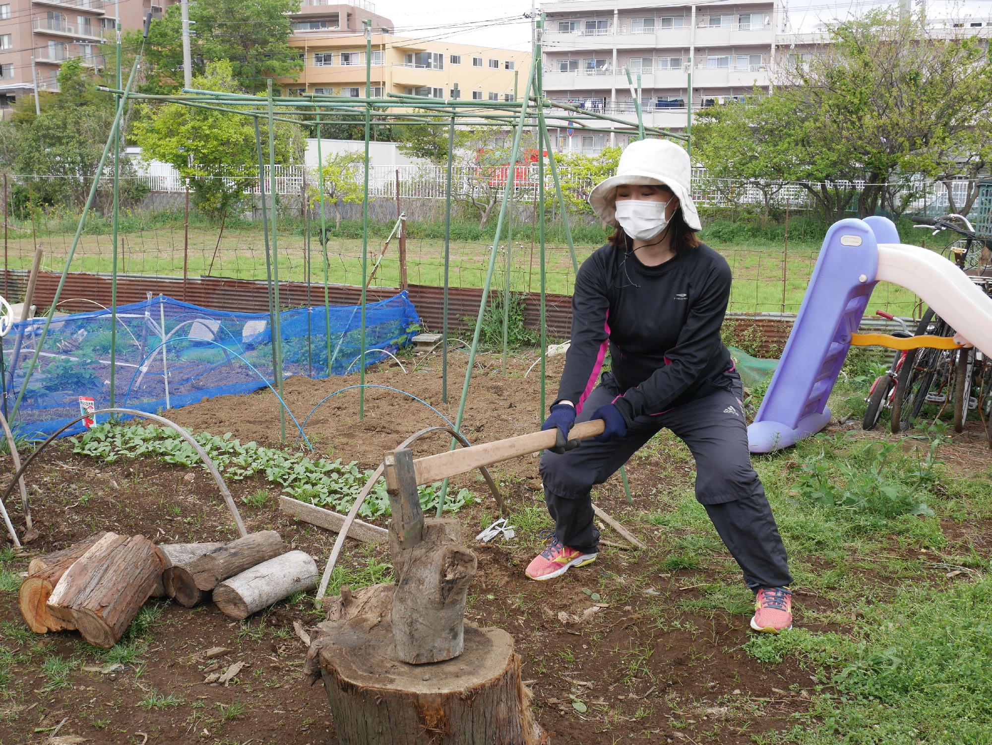 妊婦さんたちで薪割りへ!