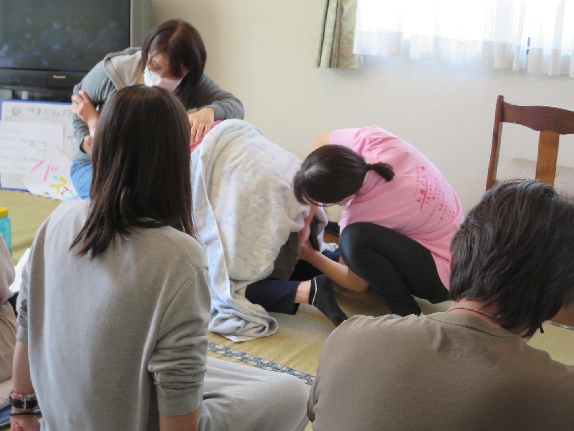 バースあおばの出産を知っている学生さんだからこそできる、迫真の演技でお産の再現をしました。