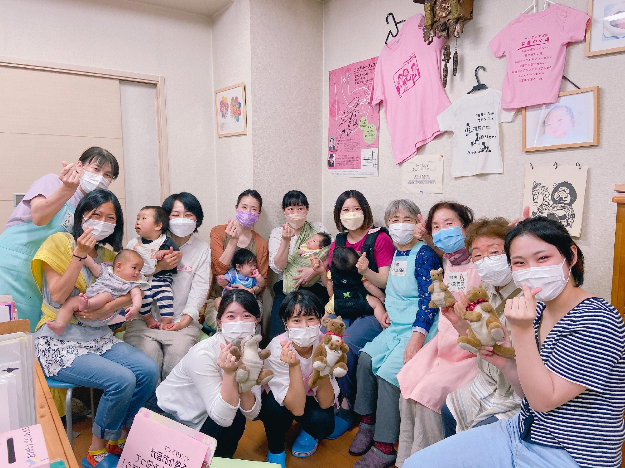 当日に手伝いに来てくれた学生さんやカンガルーの会事務局、助産師、ママたちで配信終了の記念写真!良いお産、バースあおばや助産院をみんなに知ってもらうには、次は何をする?なんてアイディアが飛び交いました!