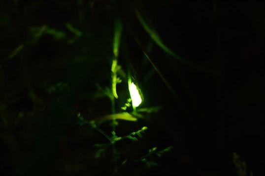 歩いていくと遠くの方にホタルたちの明りが見えています。