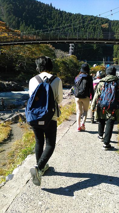朝9時。まずはJR御岳駅に、長めに歩く組が集まり、ケーブルカー滝本駅まで歩きます。40~50分程度でしょうか。最初は川沿いを歩きました。
