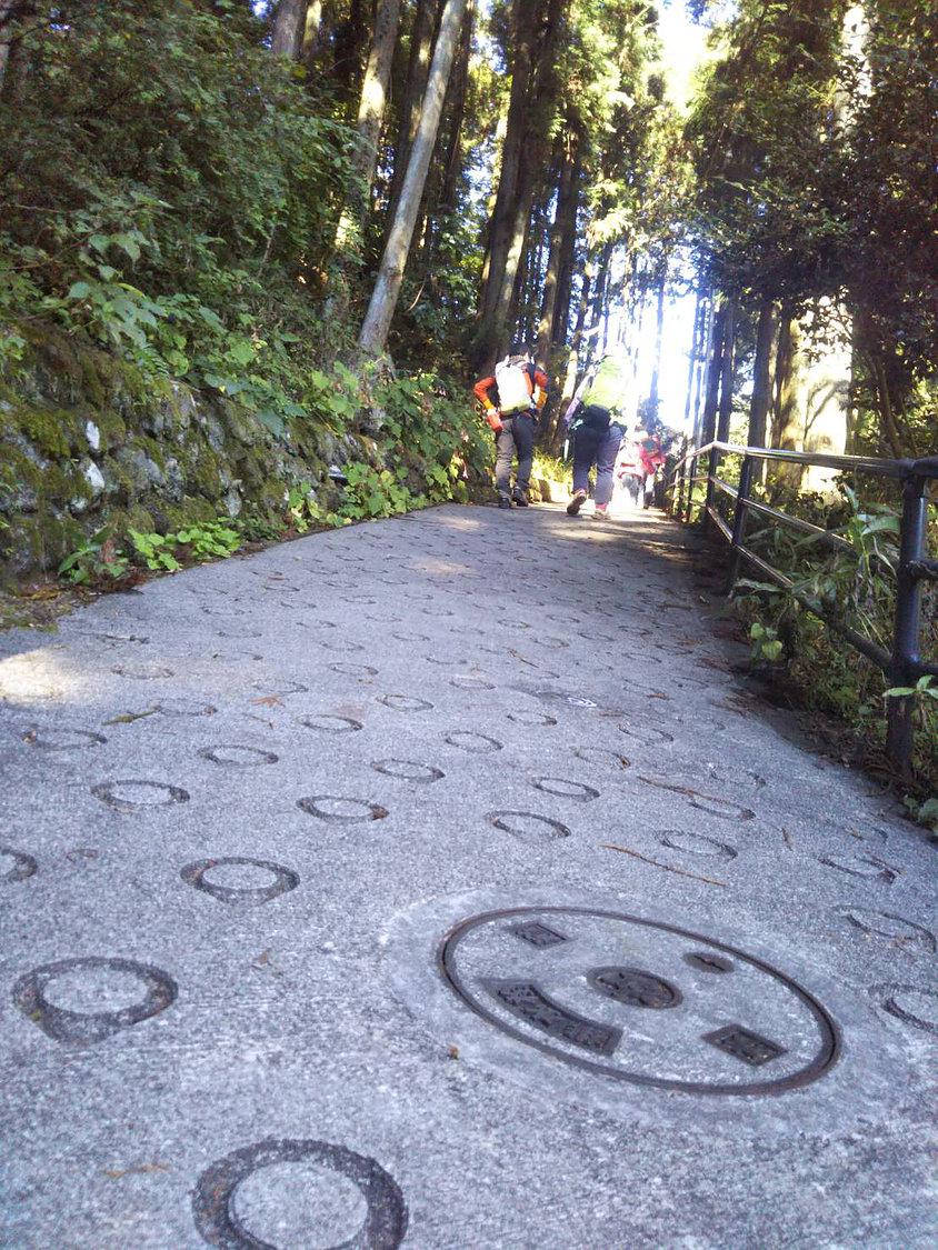 11時。みんな集合し、かなりの人数となりました。まだ0歳の子をはじめとして、子連れ組も合流です。坂を上ります。食堂や土産物店を横目で見ながら坂を上ります。けっこう急です。目指すは神社、産安社、夫婦杉。