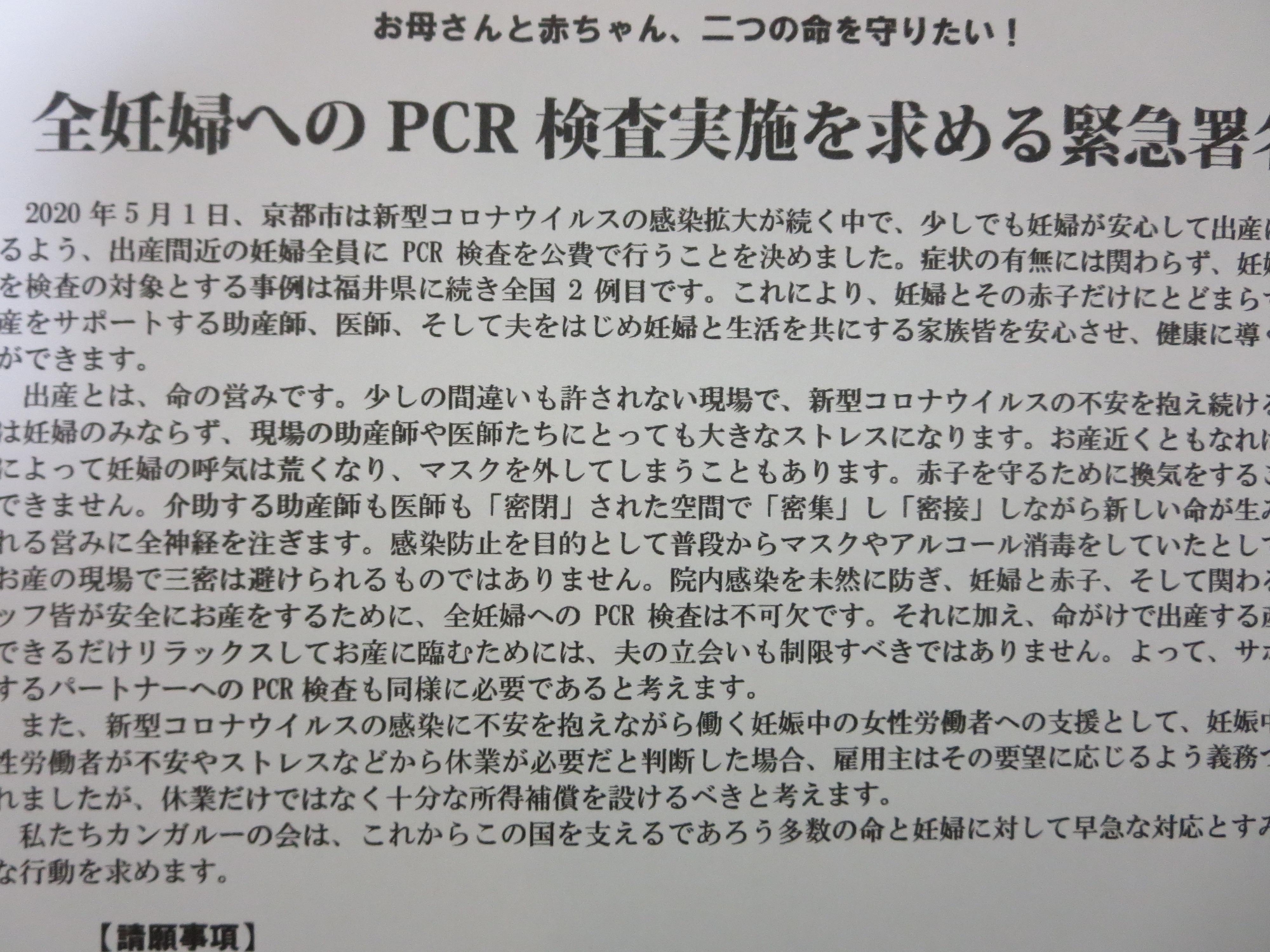 カンガルーの会が妊婦さんに無料でPCR検査を!と、電子署名が明日の午後から始まります!