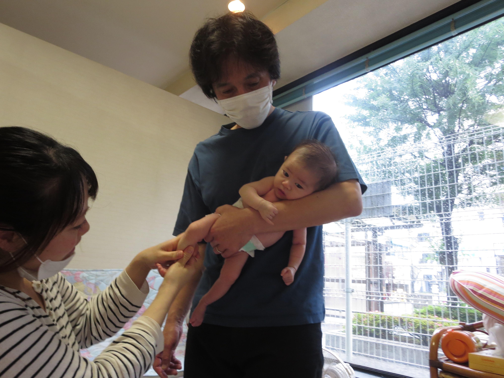 途中で泣いたときは無理せずに抱っこして。パパに「木の上の虎」ポーズであやしてもらっている間にもマッサージ。楽しそうでした!パパもママも楽しくできました!