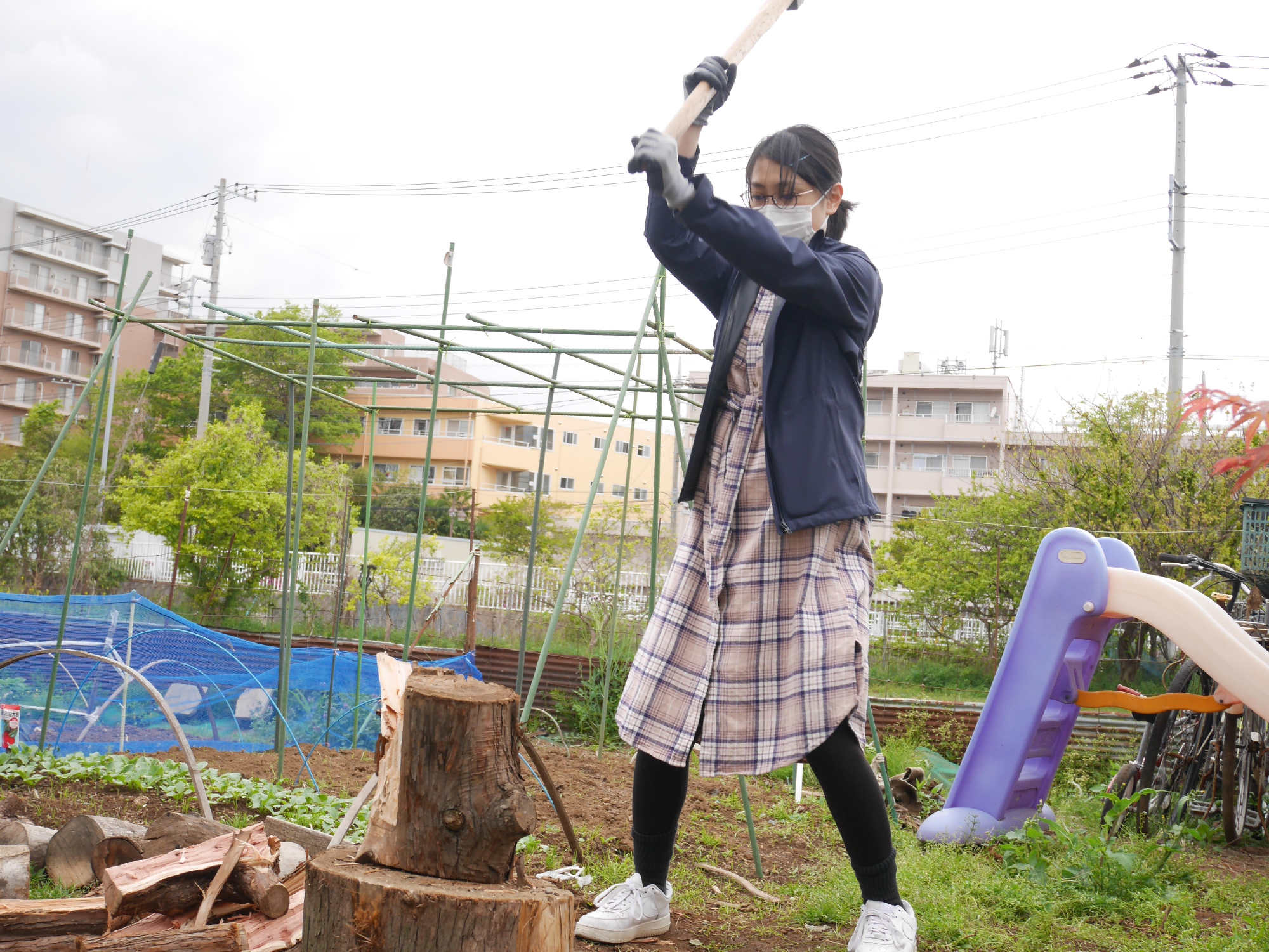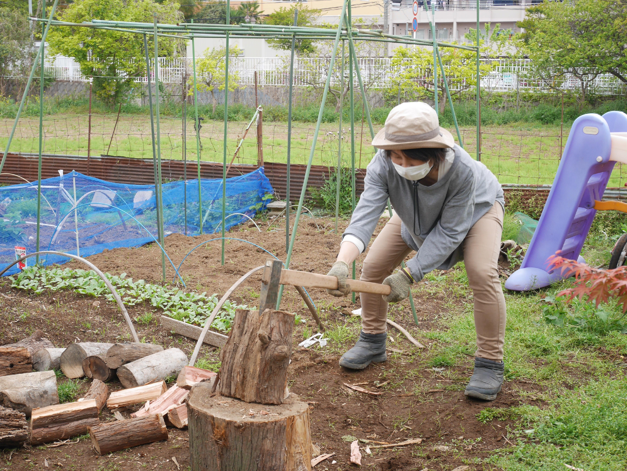 妊婦さんたちで薪割りへ!