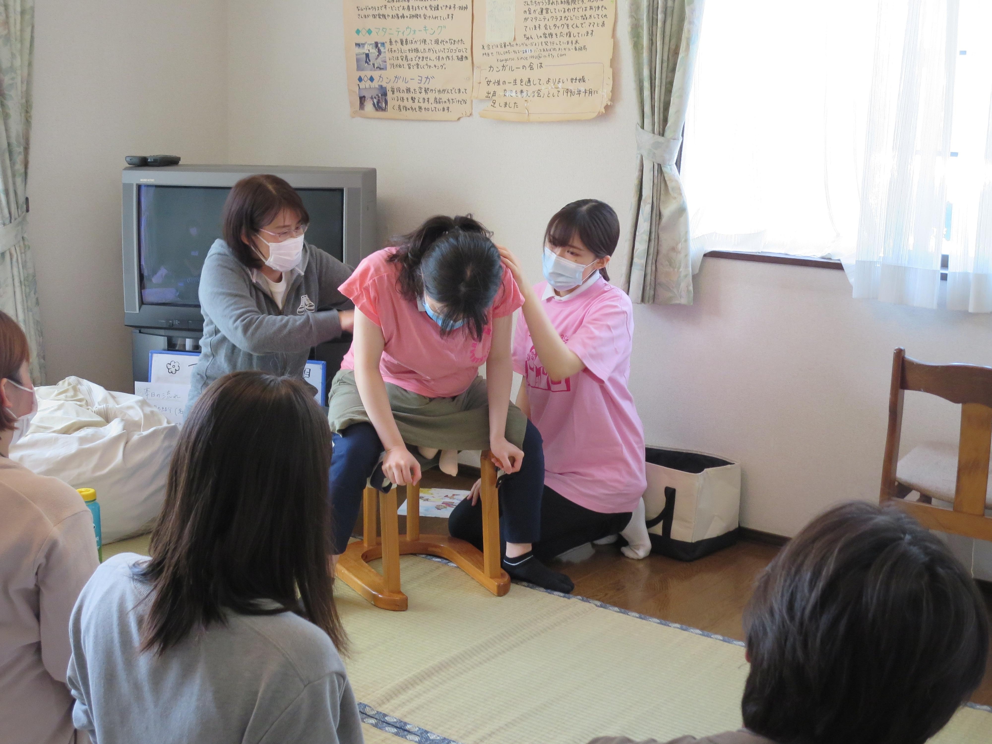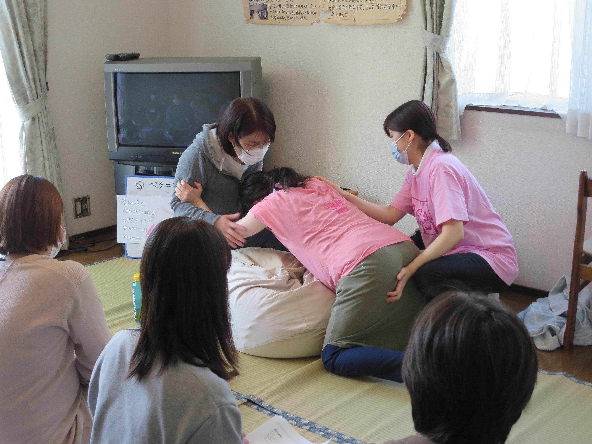 バースあおばの出産を知っている学生さんだからこそできる、迫真の演技でお産の再現をしました。